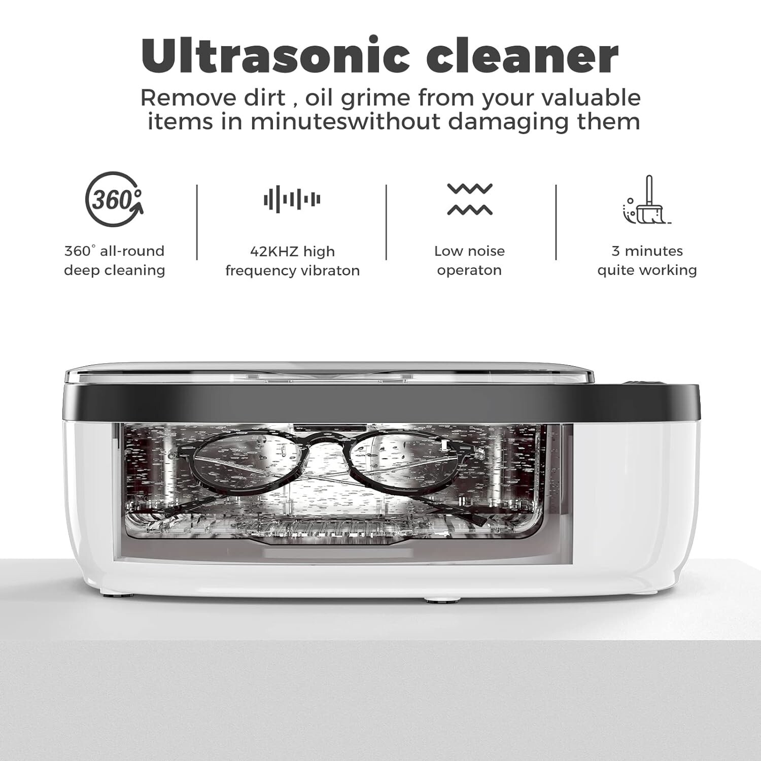 El limpiador ultrasónico hace vibrar el agua 43.000 veces por segundo para eliminar la suciedad oculta. Si hay una película protectora en sus anteojos, úsela con precaución.
